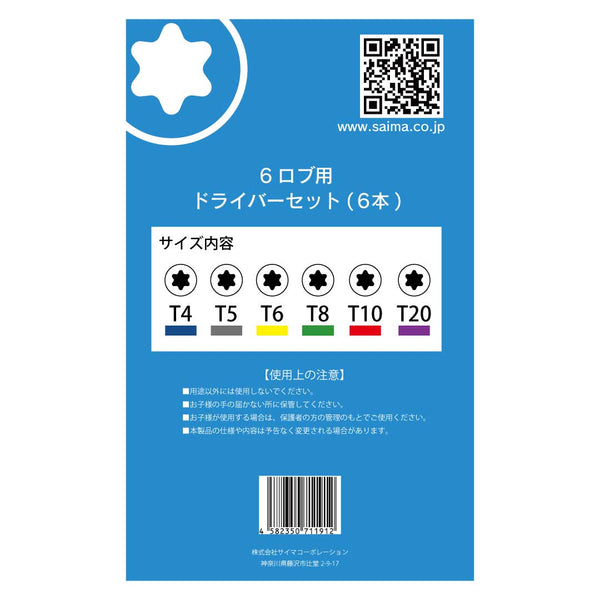 6-ロブ用 T4/T5/T6/T8/T10/T20 ハンドドライバー 6本セット